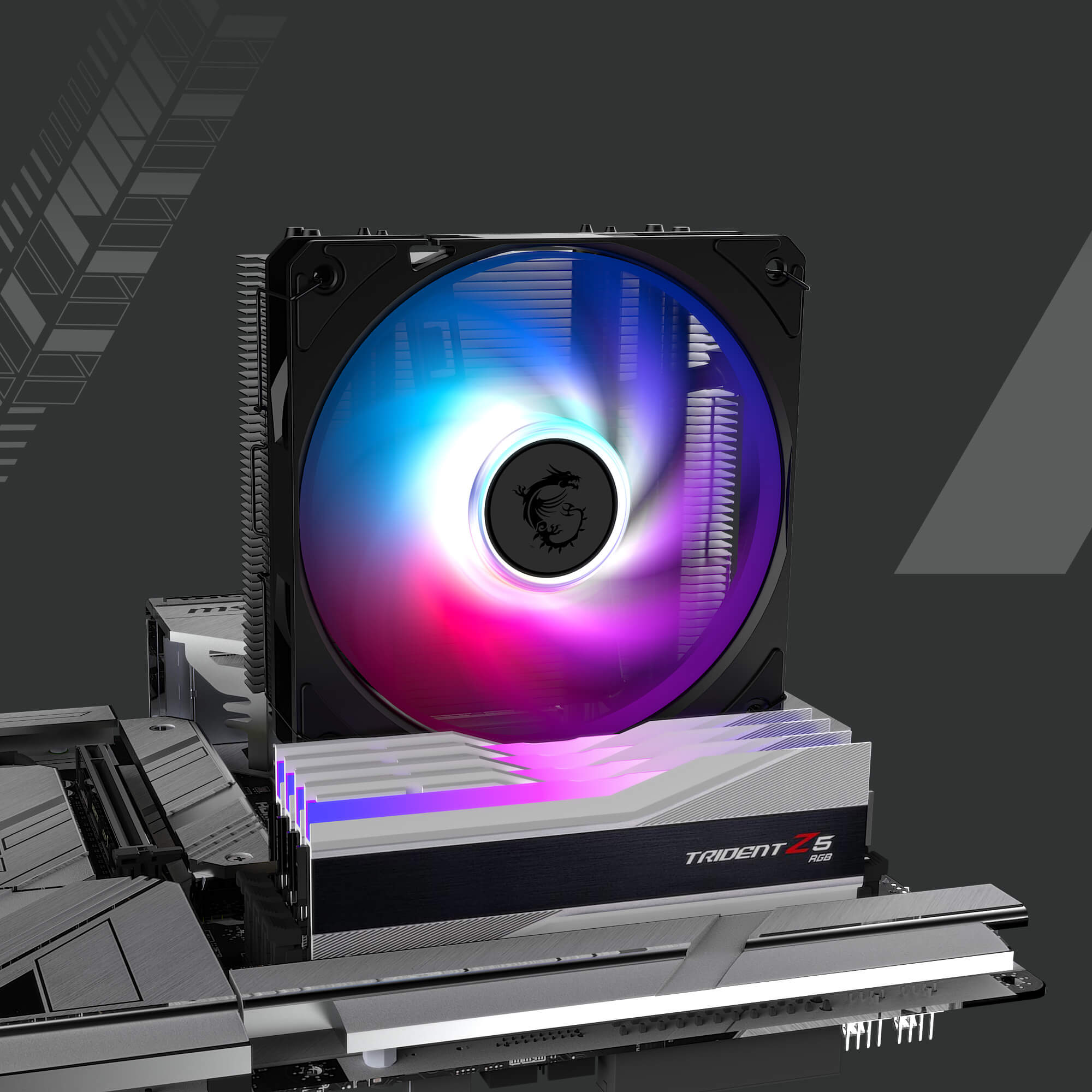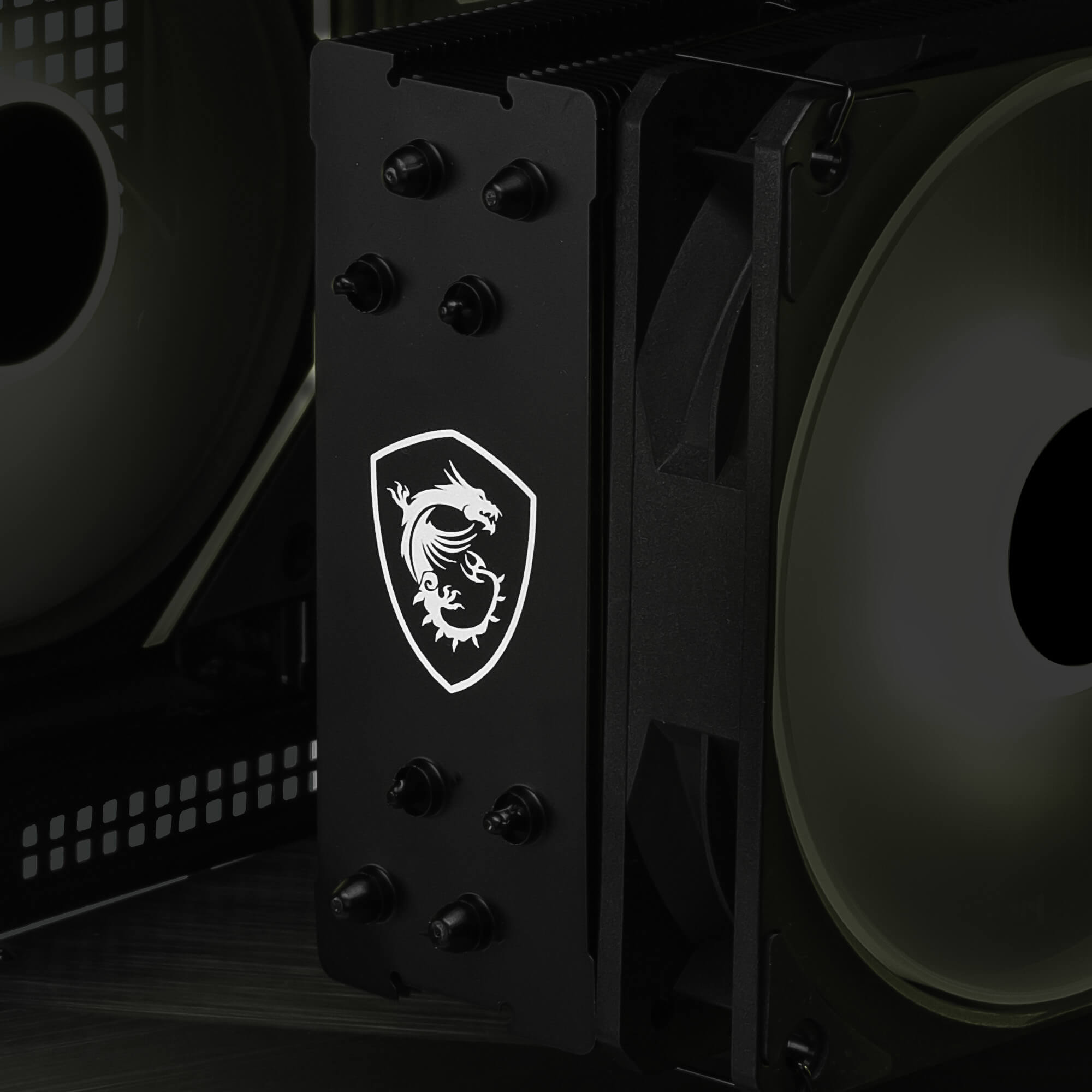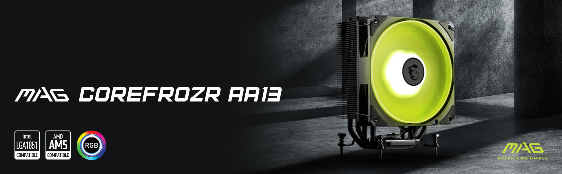 MSI MAG COREFROZR AA13 to system chłodzenia powietrzem typu single-tower, zaprojektowany z myślą o popularnych, jak i wydajnych komputerach PC. Znajdziemy tu cztery wysokowydajne, 6-milimetrowe ciepłowody oraz wentylator CYCLOBLADE 7 o średnicy 120 mm. Dzięki temu AA13 może zapewnić skuteczne i stabilne chłodzenie. Za sprawą niewielkiej, wynoszącej zaledwie 152 mm wysokości oferuje on szeroką kompatybilność z różnego rodzaju obudowami. Co więcej, może on bez problemu współpracować z procesorami umieszczonymi w najnowszych gniazdach Intel LGA 1700/1851 oraz AMD AM4/AM5.