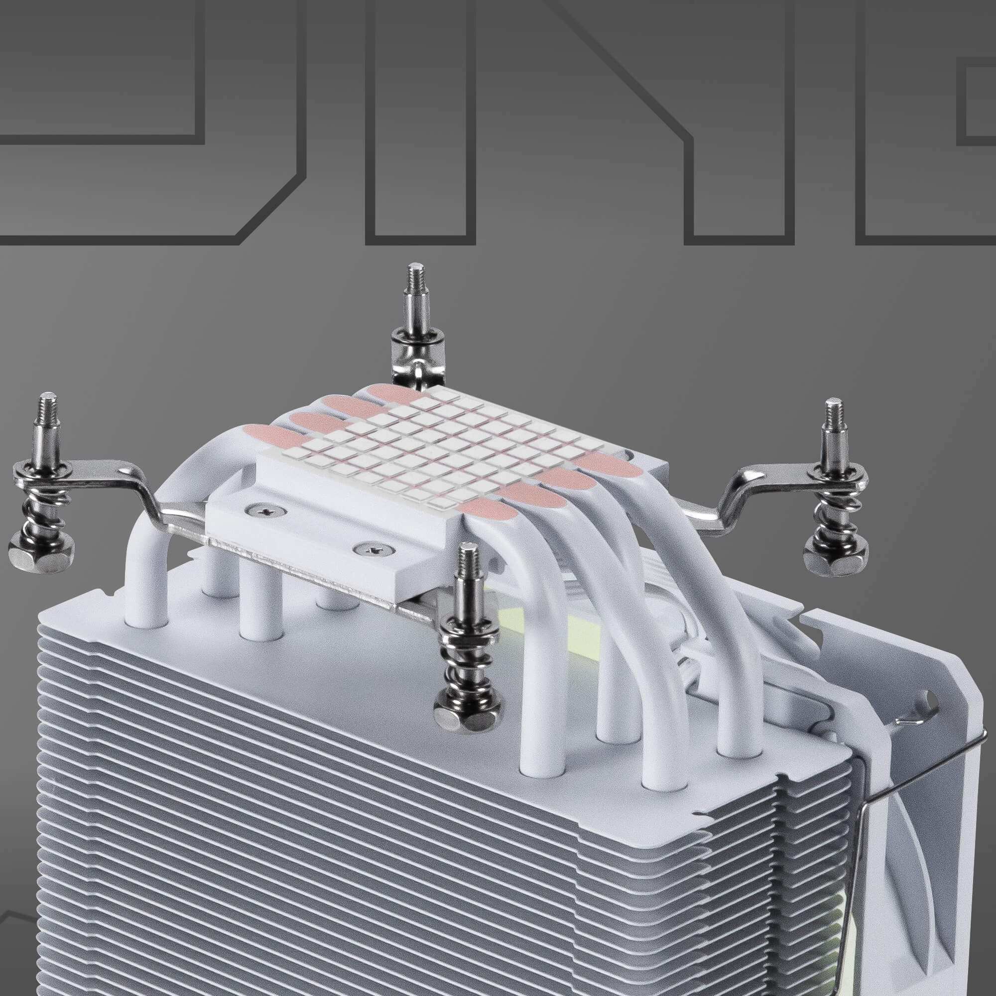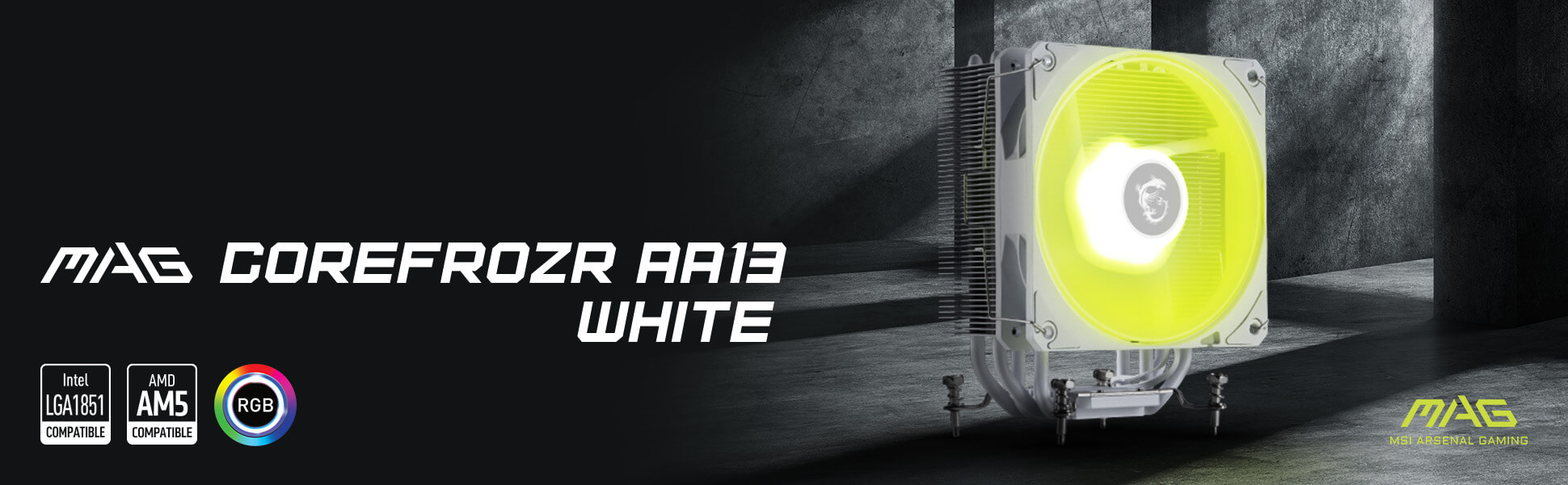 MSI MAG COREFROZR AA13 WHITE to system chłodzenia powietrzem typu single-tower, zaprojektowany z myślą o popularnych, jak i wydajnych komputerach PC. Znajdziemy tu cztery wysokowydajne, 6-milimetrowe ciepłowody oraz wentylator CYCLOBLADE 7 o średnicy 120 mm. Dzięki temu AA13 może zapewnić skuteczne i stabilne chłodzenie. Za sprawą niewielkiej, wynoszącej zaledwie 152 mm wysokości oferuje on szeroką kompatybilność z różnego rodzaju obudowami. Co więcej, może on bez problemu współpracować z procesorami umieszczonymi w najnowszych gniazdach Intel LGA 1700/1851 oraz AMD AM4/AM5.