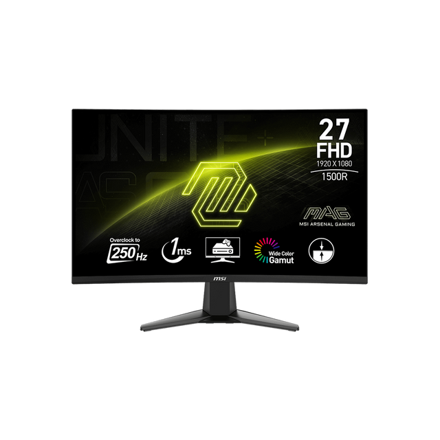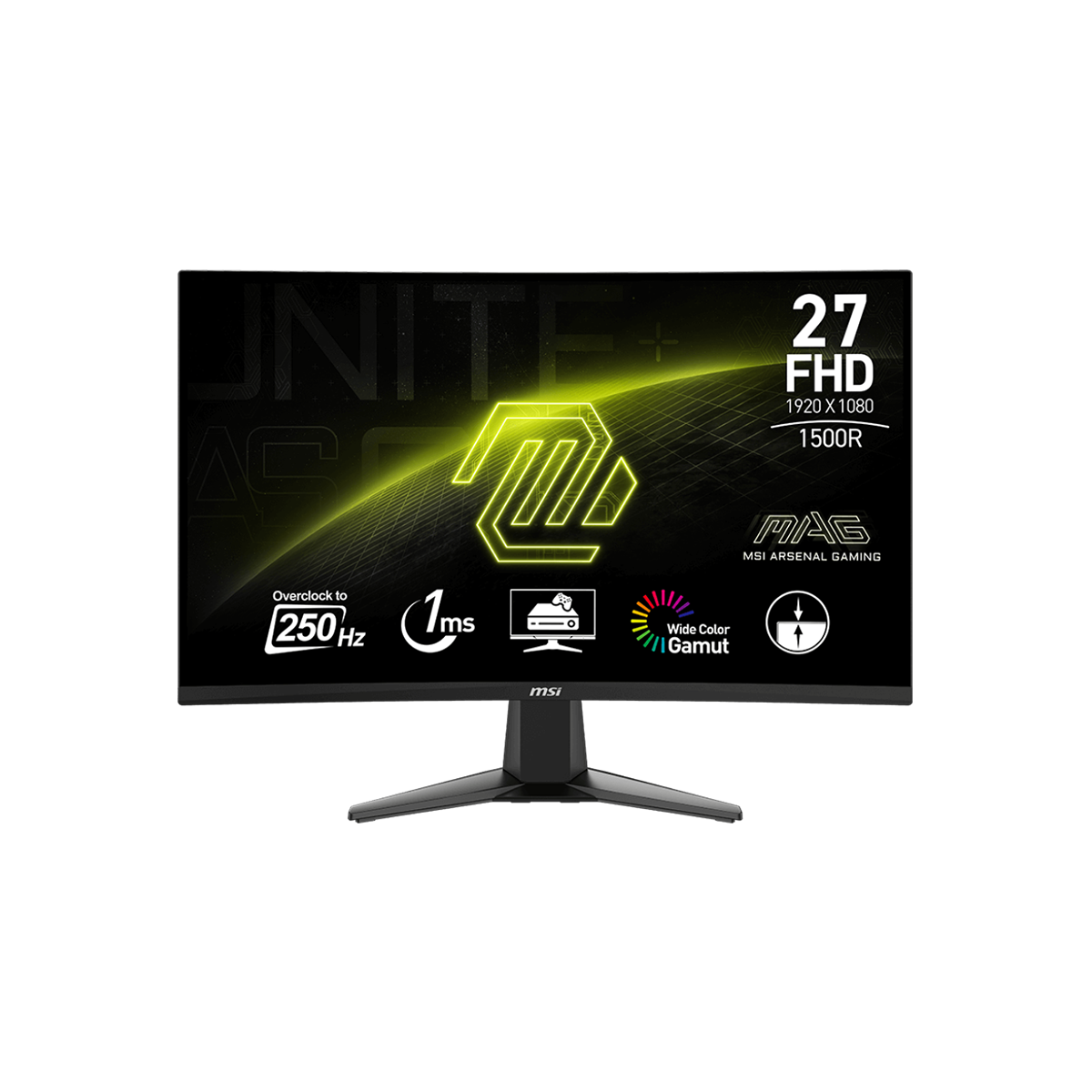 Monitory z serii MAG 27C6X wyposażone są 27-calowe panele typu VA z zakrzywionym ekranem (1500R) o rozdzielczości FHD (1920 x 1080), które charakteryzują się wysoką, 250-hercową (z overclockingiem) częstotliwością odświeżania oraz niskim, 1-milisekundowym czasem reakcji matrycy. Panele te zapewnią Ci przewagę nad wszystkimi przeciwnikami w grze. Za sprawą technologii Adaptive-Sync, monitory z linii MAG 27C6F mogą synchronizować częstotliwość odświeżania ekranu z liczbą klatek obrazu, która generowana jest przez kartę graficzną. W ten sposób możesz cieszyć się ultrapłynną rozgrywką, a dodatkowo ustawić położenie ekranu korzystając z regulacji jego pochylenia.