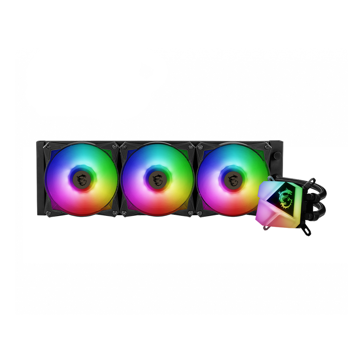 Blok wodny systemu chłodzenia cieczą z serii MAG CORELIQUID C charakteryzuje się podświetleniem ARGB rozmieszczonym na dużej powierzchni urządzenia, co sprawia, że chłodzenie to z pewnością nada blasku Twojemu komputerowi. Blok podzielony został na cztery obszary o unikatowej stylistyce przypominającej swoim wyglądem diamentowy szlif. Trzy z tych obszarów mogą rozbłysnąć wyjątkowym światłem, zaś czwarty ozdobiony jest naszym dumnym emblematem z logo MSI.