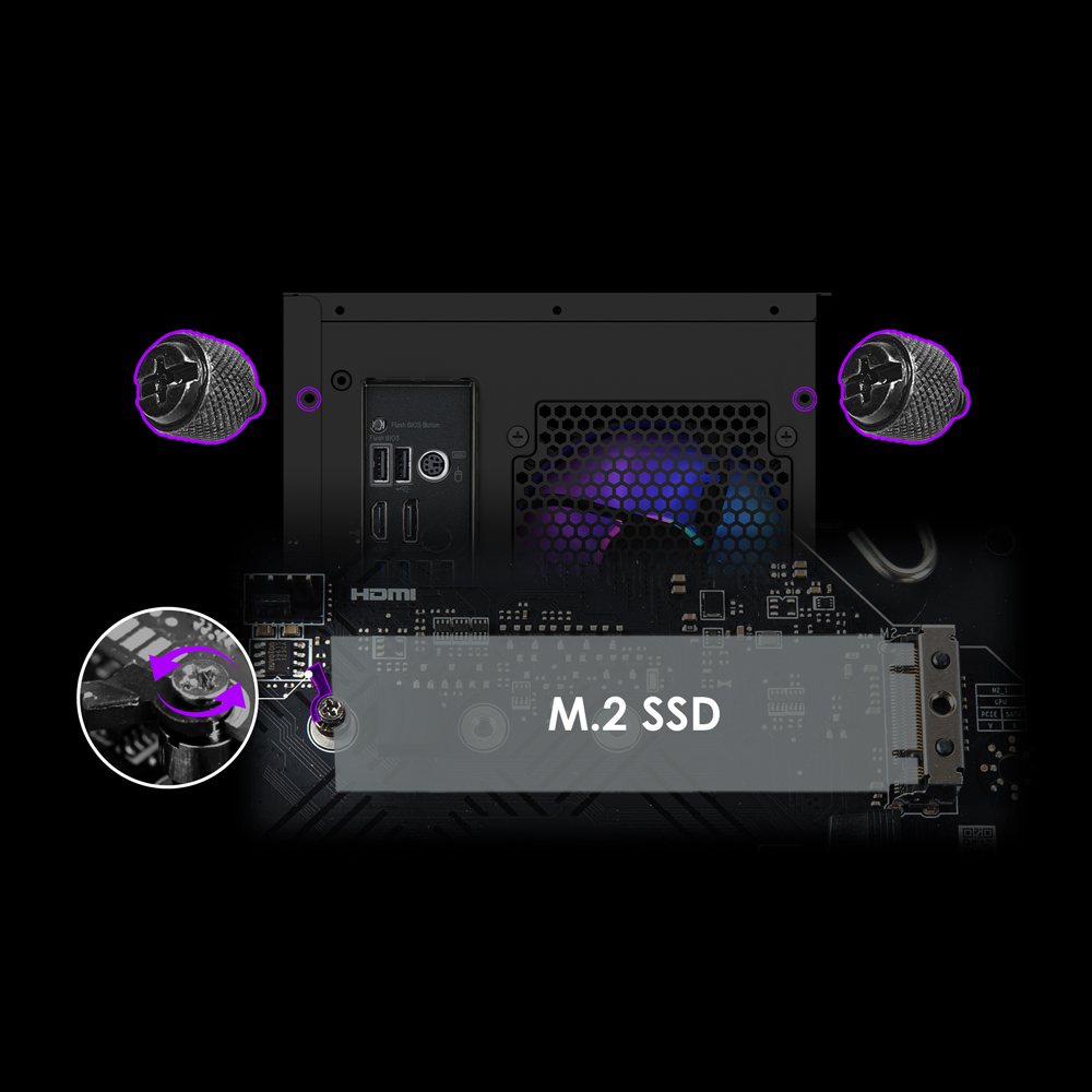 Boczny panel z hartowanego szkła można szybko i łatwo zdemontować odkręcając ręką radełkowane śruby, a zatrzask EZ Clip ułatwia wymianę i montaż dysku SSD bez użycia narzędzi.